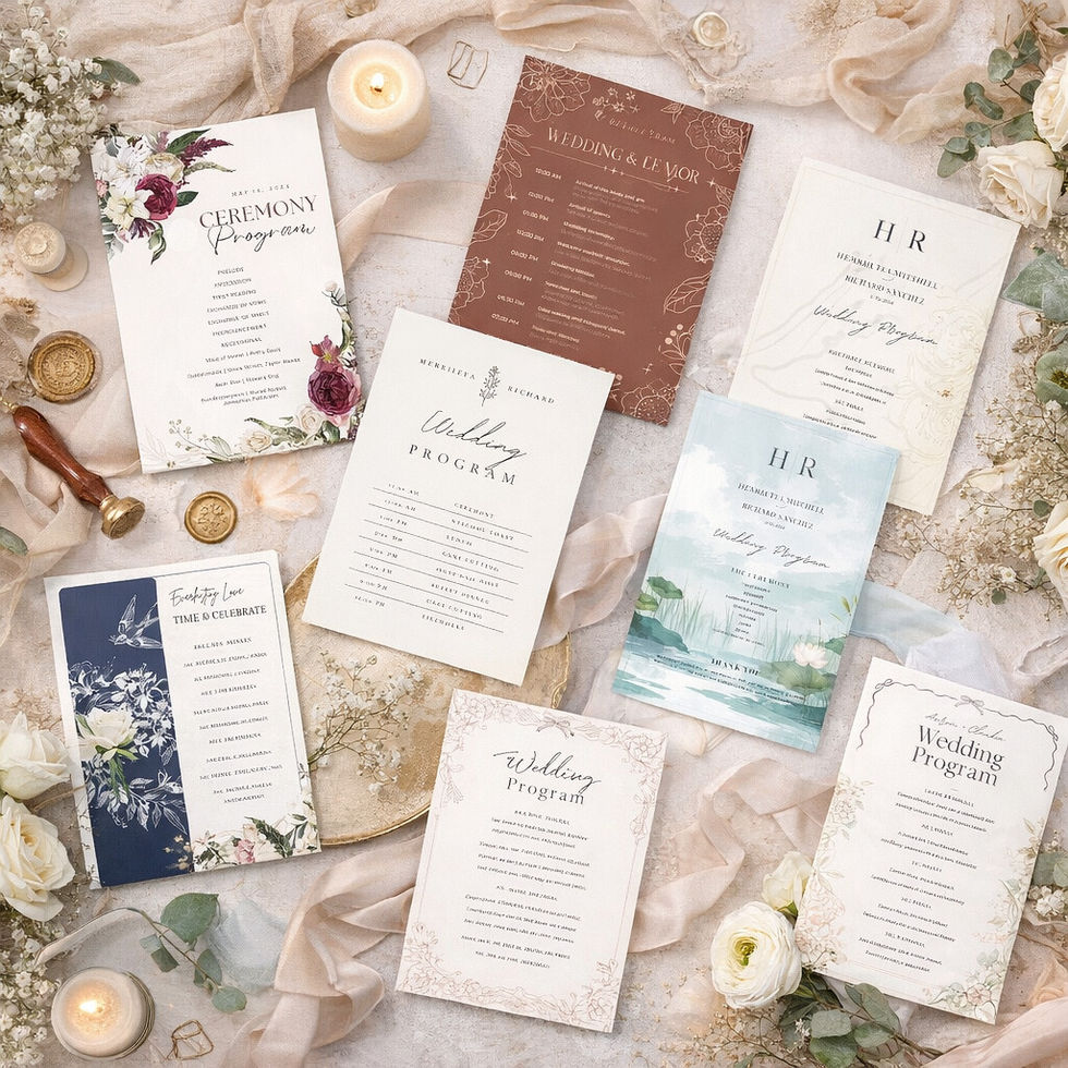 A wedding program helps guide guests through your ceremony while setting the tone for the day. We design clear, well-structured programs that outline the order of events, key participants, and meaningful details in a way that feels considered and easy to follow. Thoughtfully laid out and visually consistent with your wedding style, programs add a refined, practical touch to the ceremony experience.